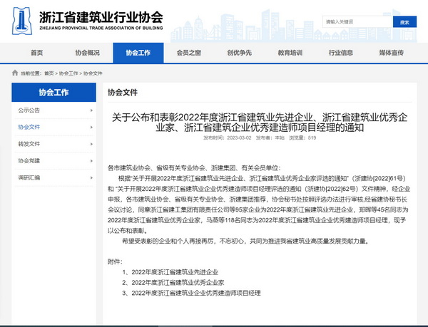 日前,浙江省建筑业行业协会公布了2022年度浙江省建筑业先进企业、优秀企业家和优秀建造师项目经理的评选结果。集团荣膺2022年度浙江省建筑业先进企业。